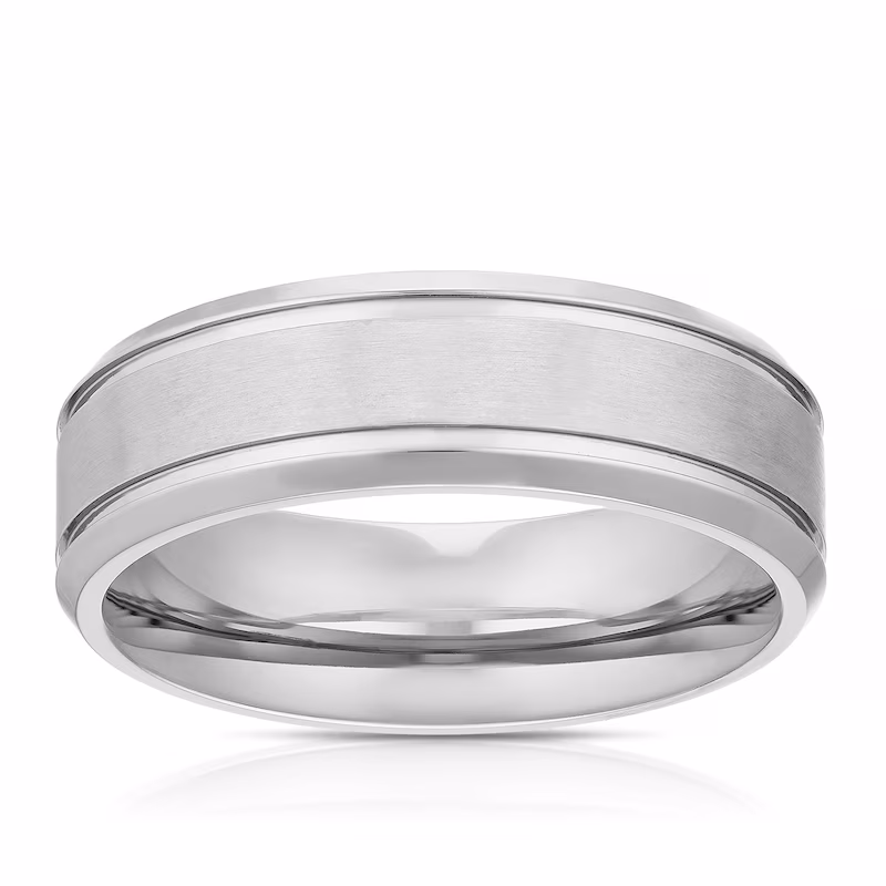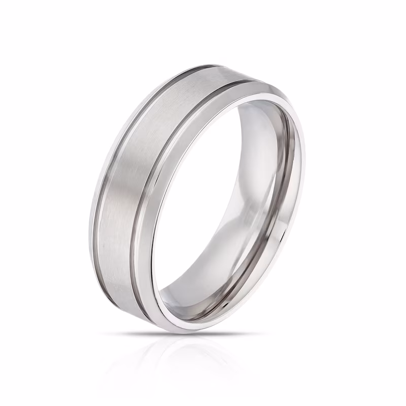 This unique ring combines sleek polished edges with a refined matte centre, creating a subtle, contemporary contrast and striking line detailing. The finish is designed for durability and comfort, making it a stylish choice for any occasion.